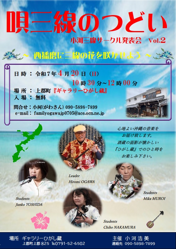 2025年4月1日 / 最終更新日時 : 2025年4月20日 webmaster 過去のイベント 4月20日(日)10:30~12:00 唄三線の集い 小河三線サークル 4月20日(日)、上郡町のひがし蔵で2回目の三線サークル発表会を行います。合奏とソロ演奏、約1時間30分の内容ですが細々と頑張っておりますので、お時間があれば是非ご来場下さいね。